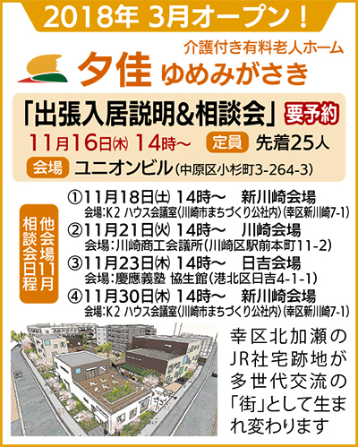 JR東日本グループが再開発中の北加瀬社宅跡地(幸区北加瀬2丁目)に介護付き有料老人ホーム「夕佳(ゆうか) ゆめみがさき」が新設される。運営はJR東日本関連企業のエヌアールイーサービス。開所は2018年3月を予定。