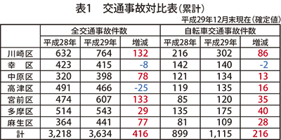 平成29年の交通事故につきましては、表1に示すとおり、平成28年に比べ全交通事故件数で416件、この内自転車交通事故件数は216件増加しています。特に、昨年麻生区において、スマートフォンを操作するなどして電動自転車を運転し、歩行者にぶつかり、歩行者が死亡する重大事故が発生しています。