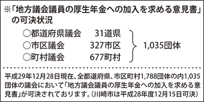 こうした中、選挙権年齢の引き下げに伴い、若者に対して政治への関心を高めるための啓発活動の充実を図ると共に、民間サラリーマン等と同様の厚生年金に加入できるようにする事は人材確保につながるものと考えます。旧地方議会議員年金は市町村合併の急速な進展による議員数の削減が行われたこと等による財政状況の悪化により持続的な制度として存続していく事が困難となり、平成23年6月1日に廃止となったものであり、議員特権との批判を受け廃止となったものではありません。平成27年10月から「被用者年金一元化」となりこれまで厚生年金と共済年金に分かれていた被用者の年金制度が厚生年金に統一されました。地方議員についても首長、地方自治体職員と同様に一般の会社員と同じ厚生年金に加入するものであり、新たに地方議会議員のみを対象とした旧地方議会議員年金制度を復活するものではありません。平成28年10月から一定の短期間の時間労働者に対する厚生年金の適用が拡大され厚生年金加入者が増加する事は政府としても推進しております。(※)しかし加入にあたっては国民世論の意見を十分に留意する事は論を待ちません。