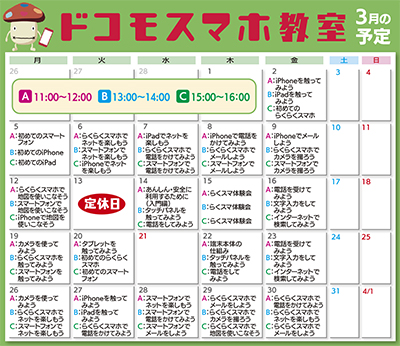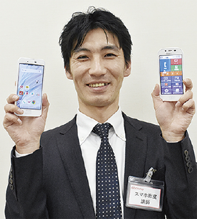 「これから買う人も、既に他店で購入した人も受講できます。スマホはたくさんの機能がありますが、大切なのは、自分の使いたい機能が使えるようになることです。わからないことは何でもお尋ねください」と話すのは、同店スマホ講師の仲井眞勇介さん。3月の教室は「スマホを触ってみよう」という入門編から「地図アプリを使いこなそう」という応用編まで、さまざまなテーマで開催。なかでも、15日(木)「らくスマ体験会」参加者には、当日スマホ購入で『使いこなしガイド』と充電器をプレゼント。