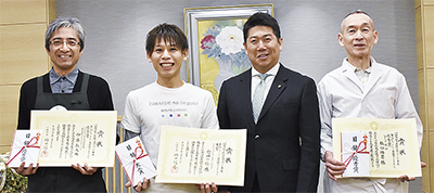 商店街活性化に貢献する優れた新店舗を表彰する「いらっしゃい!商店街のNewShop」。大賞に新丸子西口本通り新栄会の美容室「アズーロプライベートサロン(宮田一信さん)」が選ばれ、3月22日、市役所で表彰式が行われた。優秀賞のモトスミ・ブレーメン通り商店街の量り売り食品販売店「バルクフーズ元住吉店(伊藤弘人さん)」と川崎大師表参道商業協同組合の寿司店「Sushi橋口(橋口勝男さん)」とともに、福田市長から表彰状を受け取った。