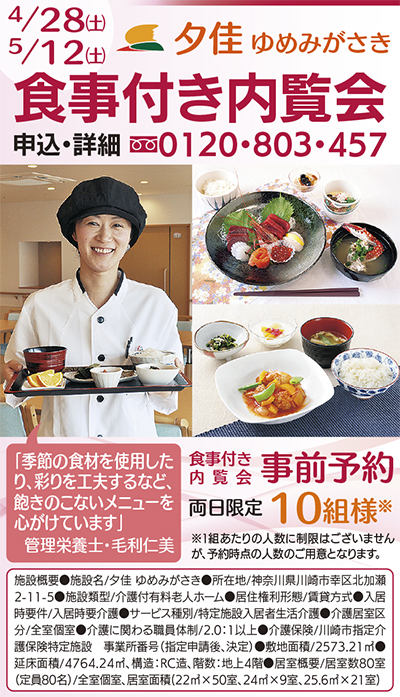 今年4月、多世代交流のまち「コトニアガーデン新川崎」のまちびらきと共に開所したJR東日本関連企業の介護付き有料老人ホーム「夕佳(ゆうか)ゆめみがさき」(幸区北加瀬2の11の5)は4月28日(土)と5月12日(土)、食事付き内覧会を開催する。両日限定10組、要事前予約。