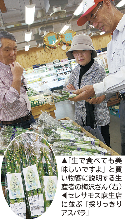 麻生区黒川の梅沢正廣さん(67)は、アスパラ栽培に挑戦している農家の一人。昨年150株を譲り受け、元木准教授の指導を受けながら、育ててきた。この春に初収穫を迎え、先月JAセレサ川崎の大型直売所「セレサモス麻生店」へ初めて出荷した。
