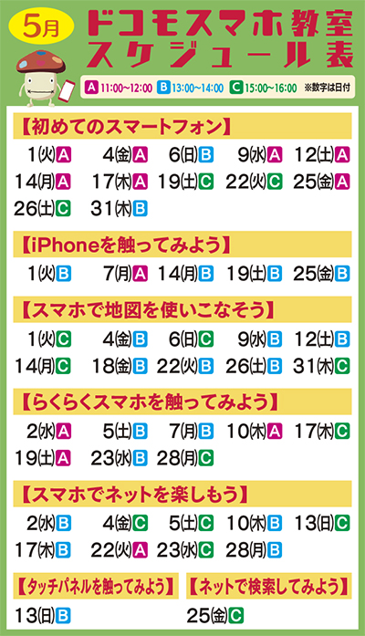 「折りたたみケータイの人も、既に他社でスマホを購入した人も受講できます。電話とメールだけでなく、地図や写真のやり取りなど、スマホならではの機能を知ってほしい。何でもお尋ねください」と話すのは、同店スマホ講師の仲井眞勇介さん。5月は「初めてのスマートフォン」「スマホで地図を使いこなそう」などをテーマに開催する(日時は左表を参照)。教室参加者にはプレゼントあり。