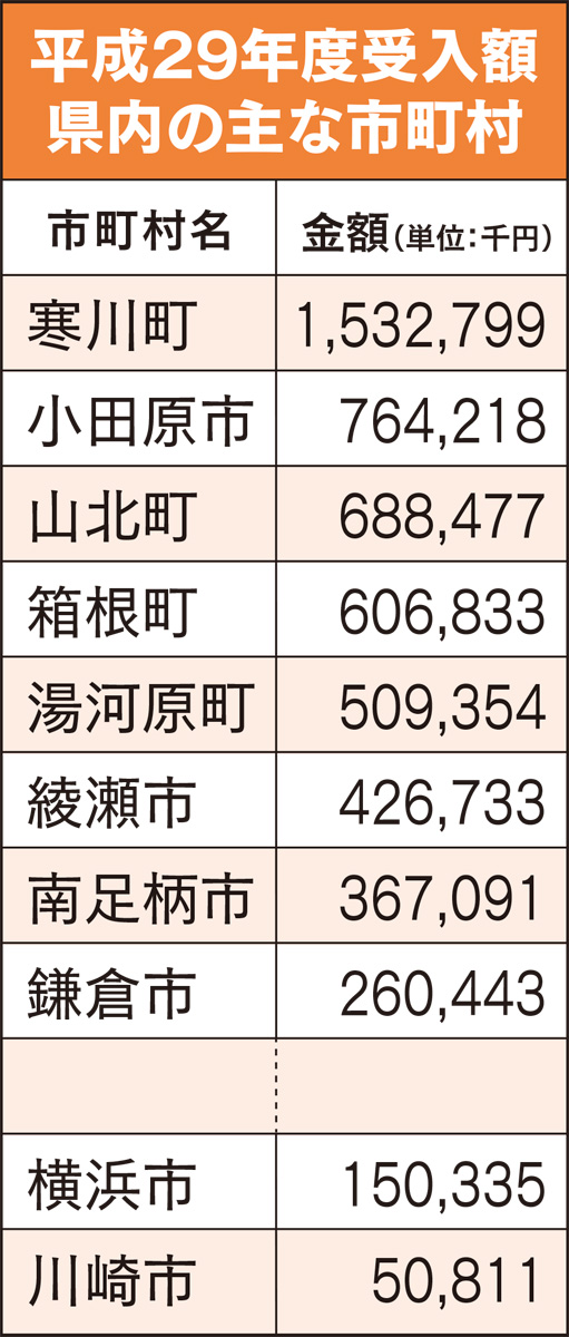 県内市町村で受入額最多は寒川町の15億3279万9千円で、受入件数は山北町の2万8678件が最多。川崎市は受入額が5081万1千円で前年度比較3115万9千円の増加、受入件数は177件で昨年度より33件増加している。