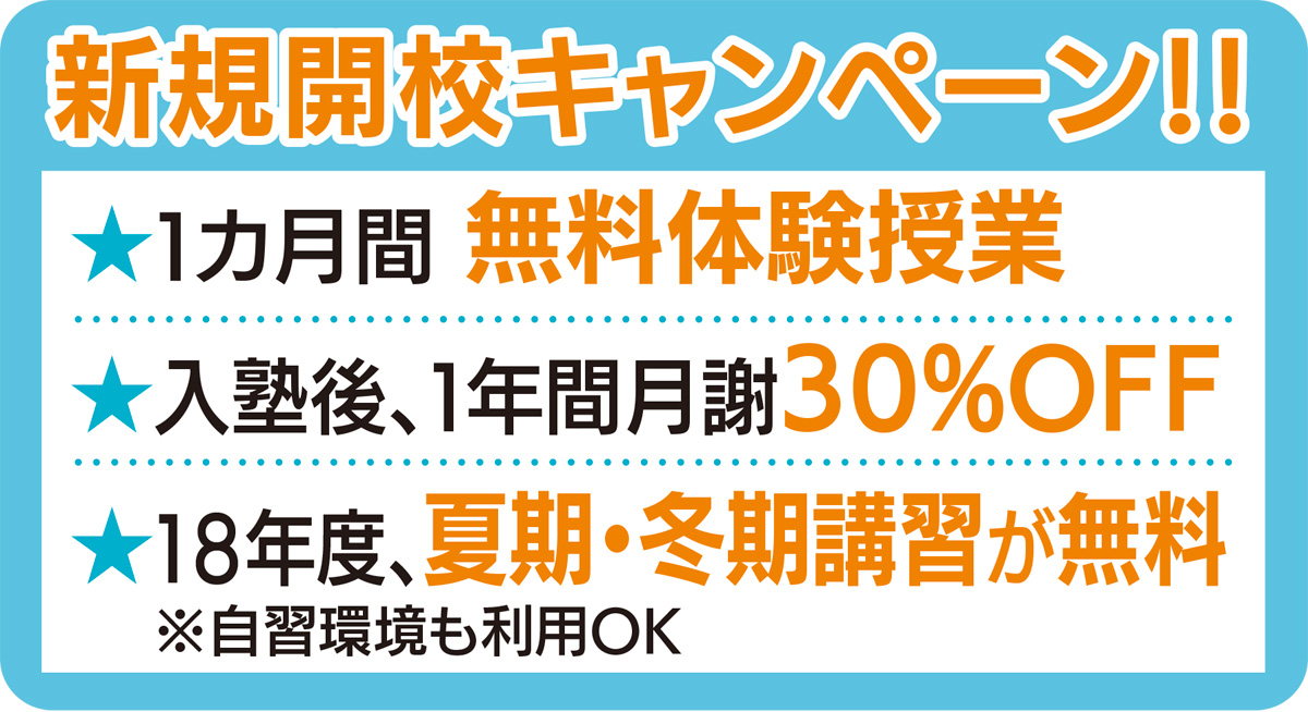 そのために設けているのが「探究」の授業。企業に勤めた経験などから将来なりたい職業について一緒に考え、目的を持った勉強を促し、充実した学びを進めていく。宮生塾長は「勉強は動機付けが大切。中高生の挑戦をサポートしていきたい」と話す。今なら、各クラス3人までの先着のキャンペーンを実施中。日程等詳細はお問合せを。