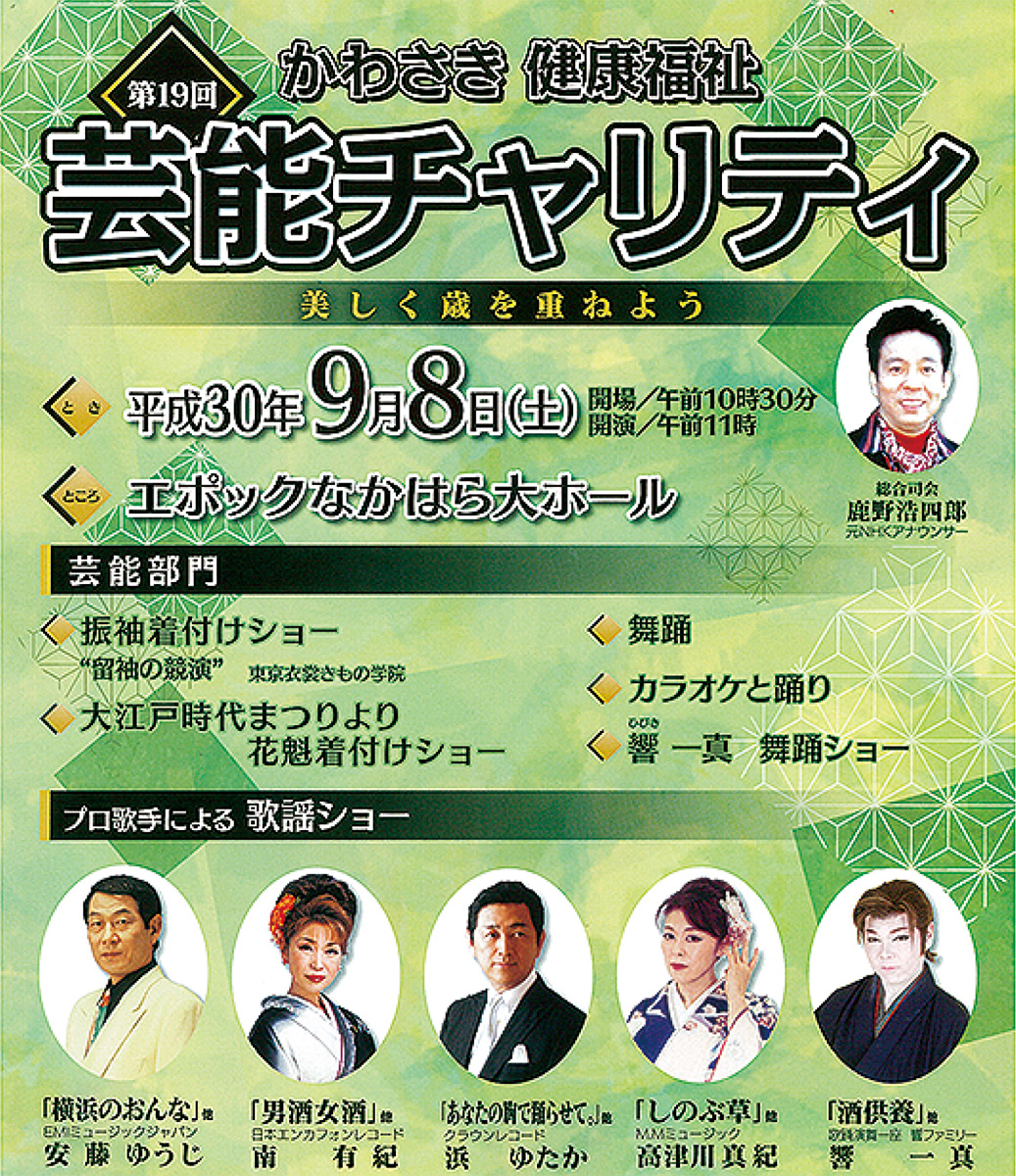 「第19回かわさき健康福祉芸能チャリティ〜美しく歳を重ねよう」が9月8日(土)、エポックなかはら(武蔵中原駅前)で開催される。午前11時開演(10時半開場)。主催はNPO法人日本伝統文化福祉振興協会(高島厚子理事長)。東京衣裳きもの学院による振袖着付けショーや大江戸時代まつりより花魁着付けショー、安藤ゆうじさんらプロ歌手による多彩なステージが披露される。