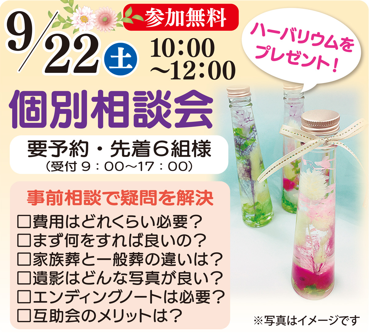 今月の事前相談会は9月22日(土)開催。現在参加者を受付中だ。参加プレゼントとして今人気の「ハーバリウム」が用意されている。申し込み・問合せは左記までお気軽に。次回は12月16日を予定。日程が合わない人は予約制で対応してくれる。