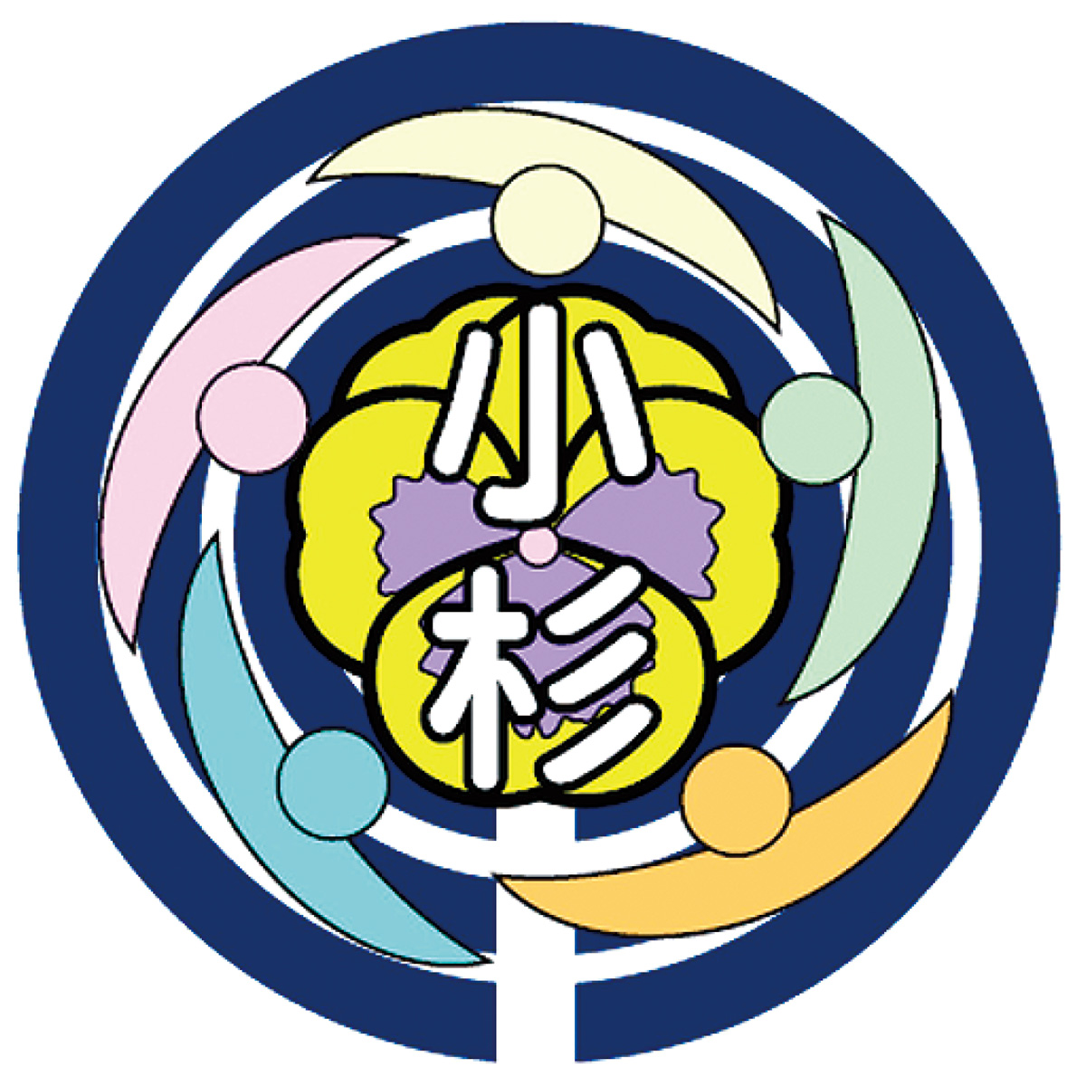 校章は「人と人が繋がる温かな雰囲気の学校」というコンセプトで、中原区の花・パンジーと学校名である「小杉」を組み合わせ、そこに多様な人が集いつながり合うイメージのデザインに仕上がった。