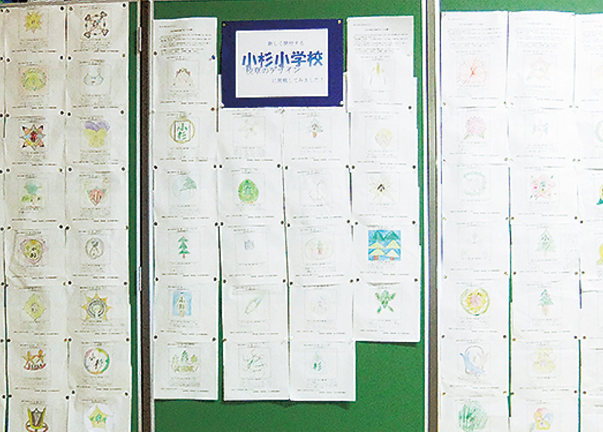 市教委は今年6月、今井小と西丸子小の6年生児童らからアイデアを募集。色鉛筆で手書きのデザイン画や新設小学校に対する考えや思いを表した言葉などがおよそ200人から集まった。その中で「小杉」の漢字を使ったもの、人が繋がったり手をつないだりするイメージ、区の花であるパンジーをモチーフにしたものなどが多かったことから、これらの要素を取り入れて最終的にデザイナーによって制作された。