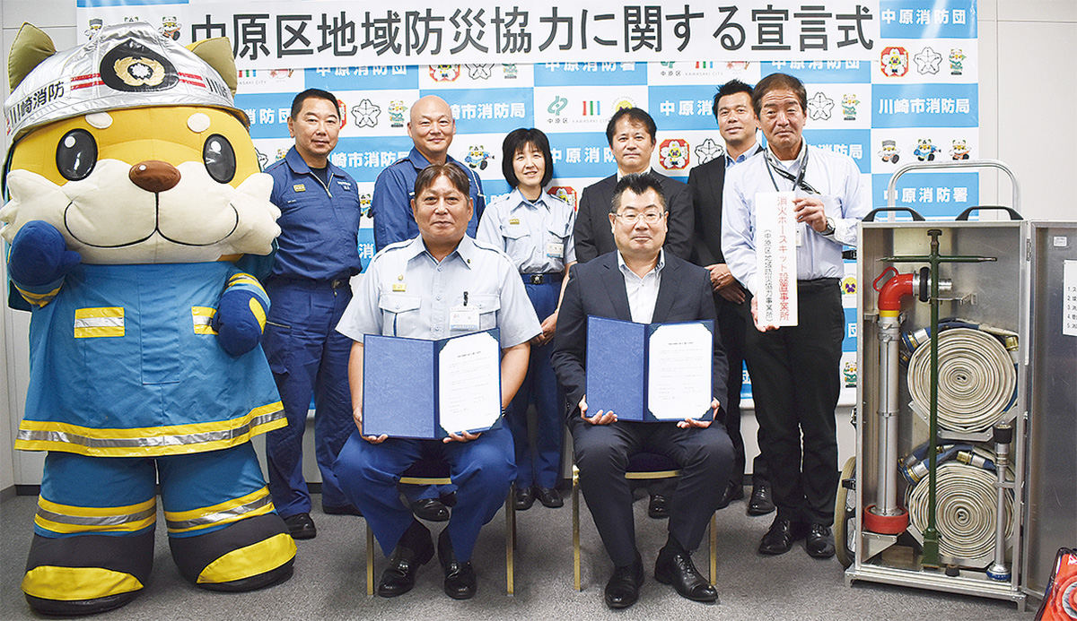富士通川崎工場(上小田中)が地元のための消火ホースキットを正門と裏門の2カ所に1台ずつ、計2台を設置したことを受けて、中原消防署(谷芳之署長)で9月12日、中原区地域防災協力に関する宣言式が行われた。