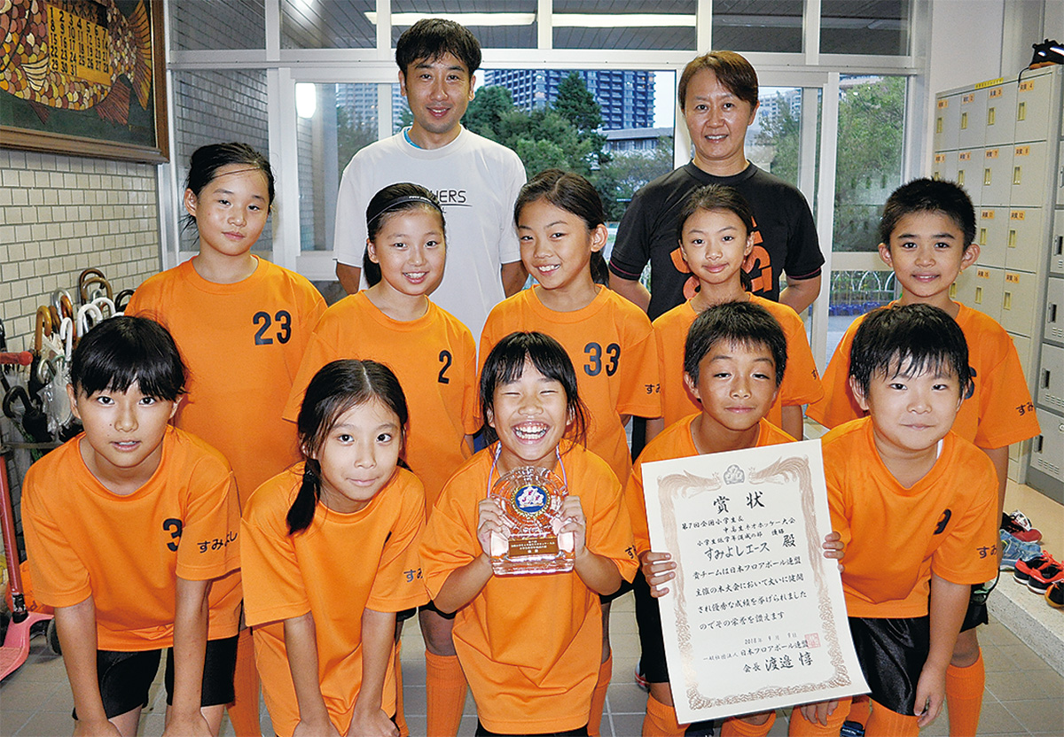 児童の指導にあたる監督やコーチは、メンバーの保護者らが中心。クラブの卒業生らもサポートに加わる。「保護者、地域が一丸となって掴んだ優勝。学校の理解もあってこそ」と山下さん。15日には東住吉小の教員らに優勝を報告。志村辰也校長からは「当校の体育館で練習し全国を制したのは嬉しい。今後も頑張って下さい」と労いの言葉が贈られた。