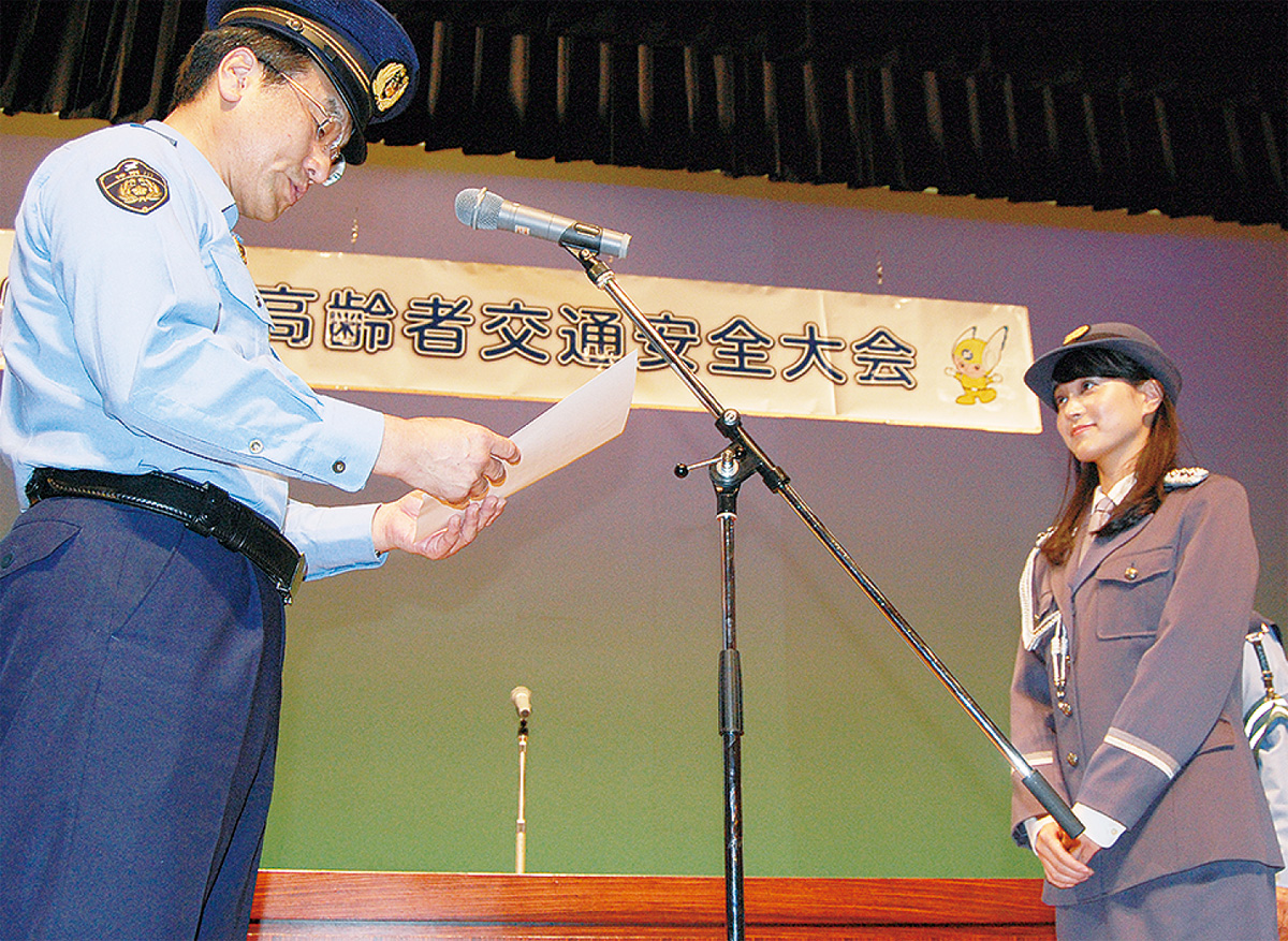 当日は、かつて区内の小学校に通っていたテレビ朝日アナウンサーの池谷麻依さんが一日警察署長に迎えられ、則次誠二郎署長から委嘱状が送られた=写真。池谷さんは「皆様、事故に遭わないよう、起こさないように気を付けてください」と呼びかけた。その後は、平間幼稚園園児による合唱、県警音楽隊による演奏が行われ、交通安全講話や寸劇で啓発を行った。