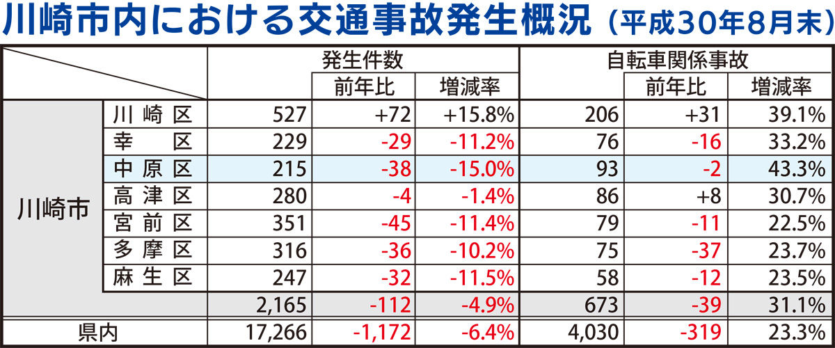 平成30年8月末における交通事故発生件数は、川崎市全体では2165件(前年比マイナス112件)、中原区では215件(同38件)であり、交通事故は減少しています。また、自転車関係事故の件数についても、川崎市全体では673件(同39件)、中原区では93件(同2件)であり、こちらも減少しています。