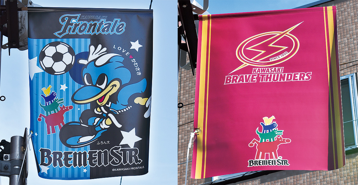 掲示されたのは、プロバスケB1「川崎ブレイブサンダース」=写真右=とJリーグ「川崎フロンターレ」=写真左=の2チームのフラッグ。いずれも同商店街が費用を負担し、それぞれおよそ40枚用意。同商店街とチームのロゴをあしらった。川崎ブレイブサンダースのフラッグを作成したのは、今回が初めて。