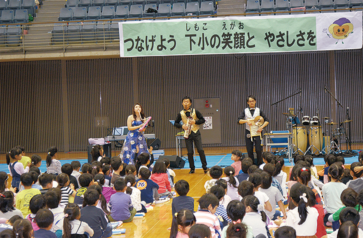 児童984人、職員と保護者合わせて1000人以上が訪れ、4年生の音楽演奏でスタートした。スローガン「つなげよう下小の笑顔とやさしさを」の発表や児童から応募があったデザインで制作されたマスコットの紹介、ピアニカバンドとのコラボが行われるなど、児童らが一体となって同校の50周年を祝った。