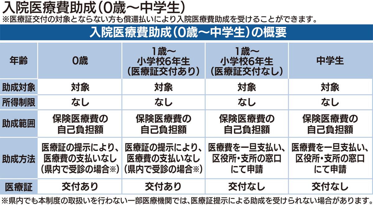 なお、平成31年1月からの入院医療費助成(0歳〜中学生)の概要は、別表のとおりです。また詳細については、「中原区役所区民サービス部保険年金課国保給付・医療費助成係 【電話】044・744・3202」までお問い合わせ下さい。