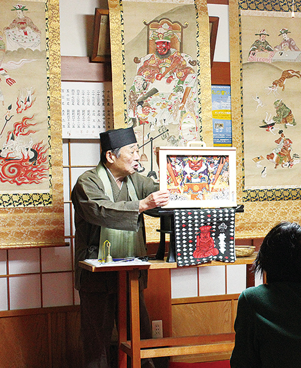 下小田中の安楽寺(宗澤文良住職)で1月16日、恒例の「六道地獄絵」御開帳が行われた。大道芸研究会6代目会長・麻布十兵衛氏が、地獄の世界を描いた紙芝居『小僧さんの地獄めぐり』の読み聞かせと絵説き口上を披露。江戸時代中期に描かれたという11幅の地獄絵を前に、冥途の旅路や三途の川、与えられる罰などを解説した。参加者はその独特の語り口に耳を傾けていた。