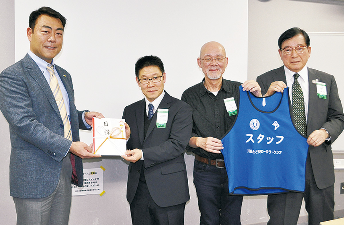 地元の経営者や代表者らが集う奉仕団体、川崎とどろきロータリークラブ(井上佳則会長)は1月24日、川崎市聴覚障害者情報文化センターへ災害時用ビブスを120着寄贈した。聴覚障害者は警報音や放送等の音声情報が入らないだけでなく、外見からは障害者だと判断されづらいため支援も受けにくい。今回のビブスは、そうした災害時や訓練で活用できるよう、人目につきやすい青地に、聞こえが不自由なことを表す「耳マーク」などがプリントされた。同センター施設長の尾上秀夫さんは「大変有難い。様々な活動の中で使わせていただき、その成果をご報告したい」と、手話通訳者を介し感謝を伝えた。