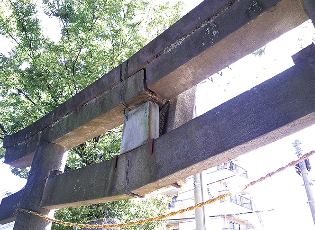 以前の鳥居は約200年前、江戸時代後期の文化12年に建立されたもので関東大震災にも耐えたという。しかし、昨年9月の強い台風により鳥居上部の石に割れ目が入り、中央に掲げられている額縁が剥がれ落ちそうなった。台風の翌日、氏子総代がその状態を確認。参拝者に危険があってはならないと、早急に地元石材店に依頼してロープで止めるなどの応急処置を行った。