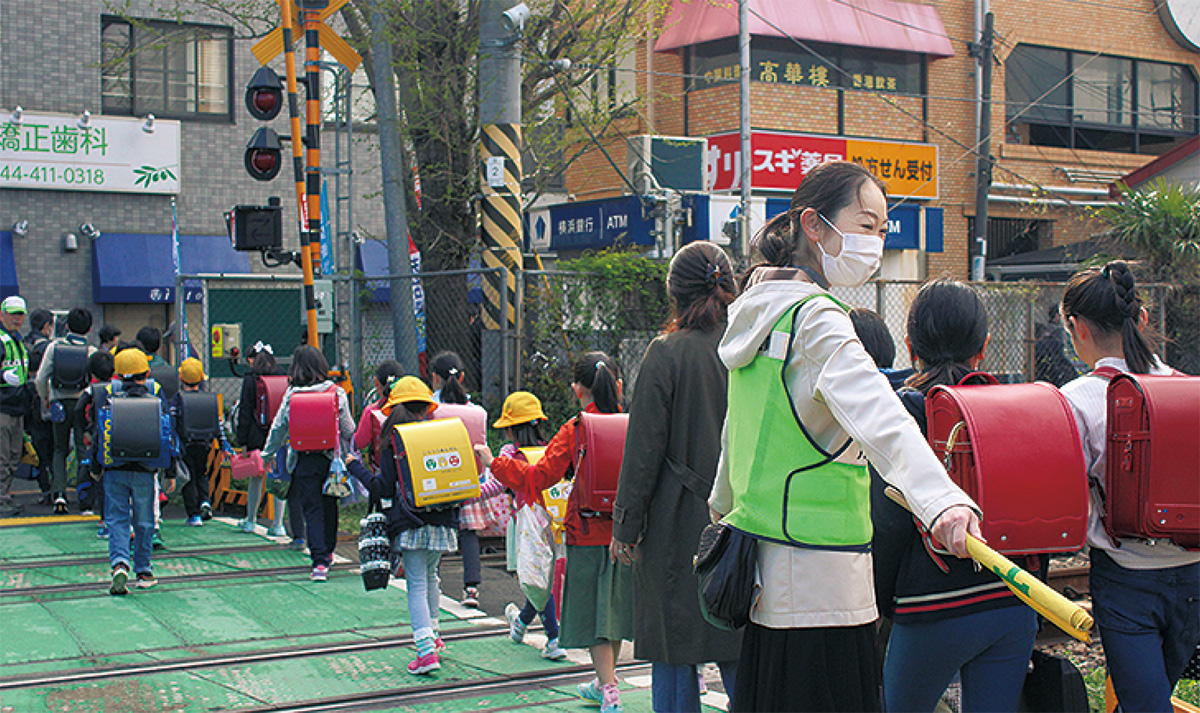 また、PTAや近隣商店街からのボランティアも毎朝見守りを行っているほか、PTAのボランティアで通学路の危険個所と注意点をまとめた「通学路きけんポイントマップ」を作成し、同校で配付している。メンバーの一人、国谷澄子さんは「一昨年に起きた接触事故をきっかけに見守りを始めた。PTAのボランティアは現状3人。あと2、3人踏切を渡った商店街側の通りで児童の整列を見守る人が増えてくれれば」と話す。