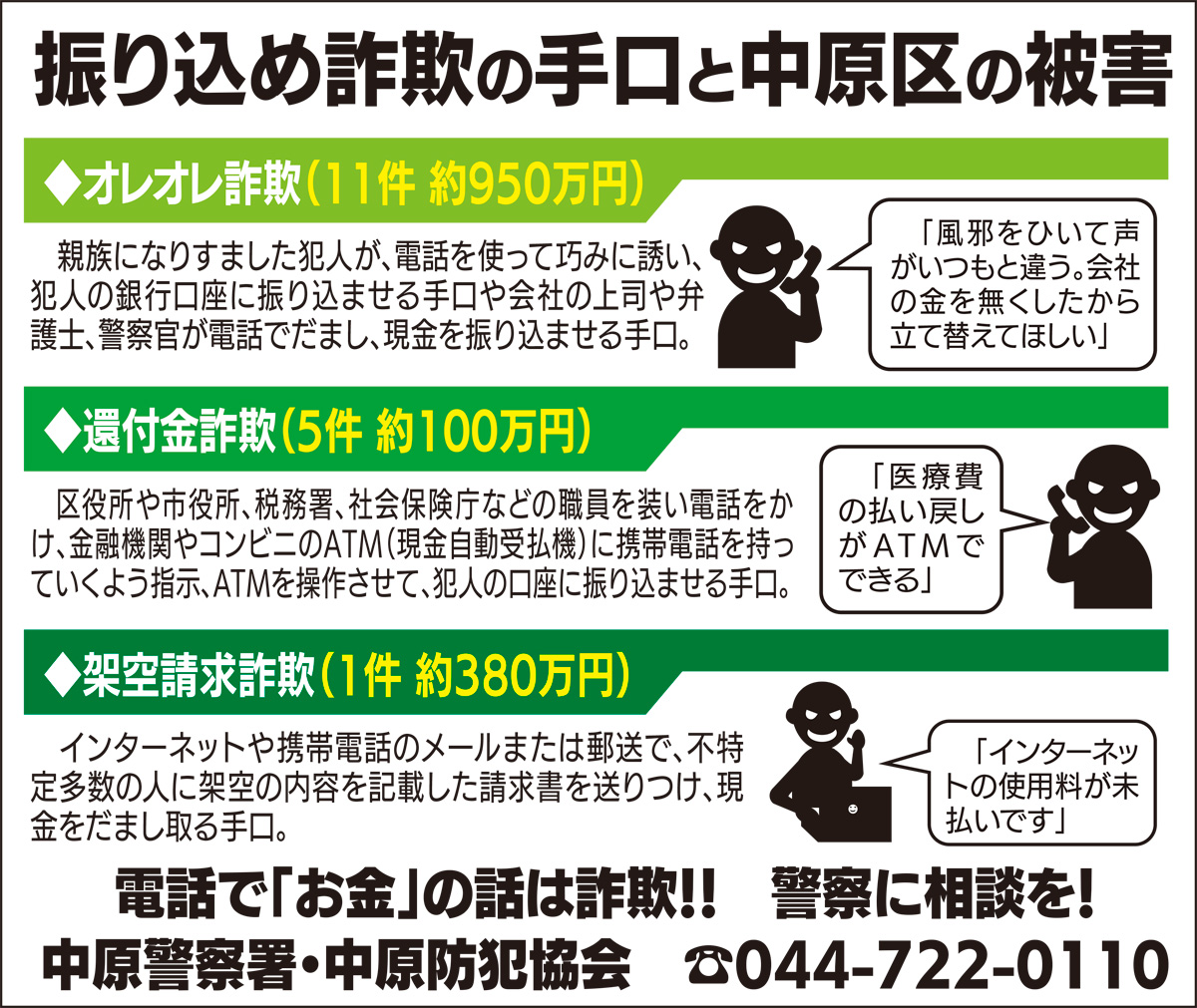 中原区内で振り込め詐欺発生 ─1430万円の被害─