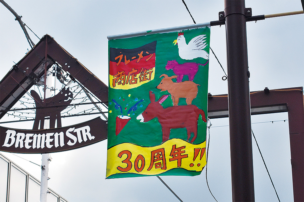 今年30周年を迎えたモトスミ・ブレーメン通り商店街に記念バナーが今月3日、登場した。裏面には、住吉小学校の生徒らが描いたイラストが華を添えている。