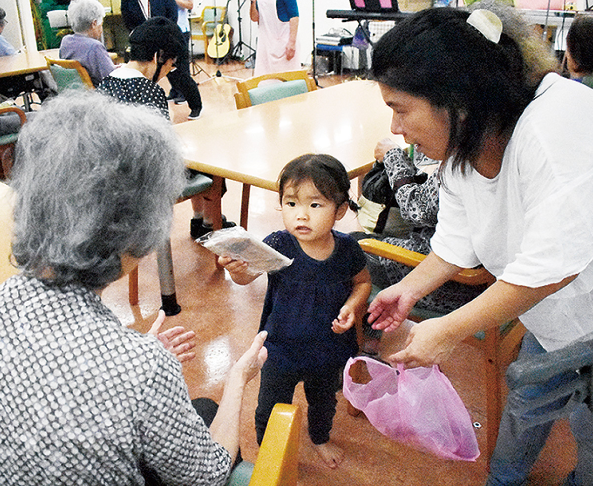 幼児らは敬老の日を祝うため布で作ったポケットティッシュ入れを高齢者に贈った。伊東代表は「最初は不安そうだった子が笑顔で高齢者と触れ合っていた。皆さん嬉しそうで良かった」と話した。