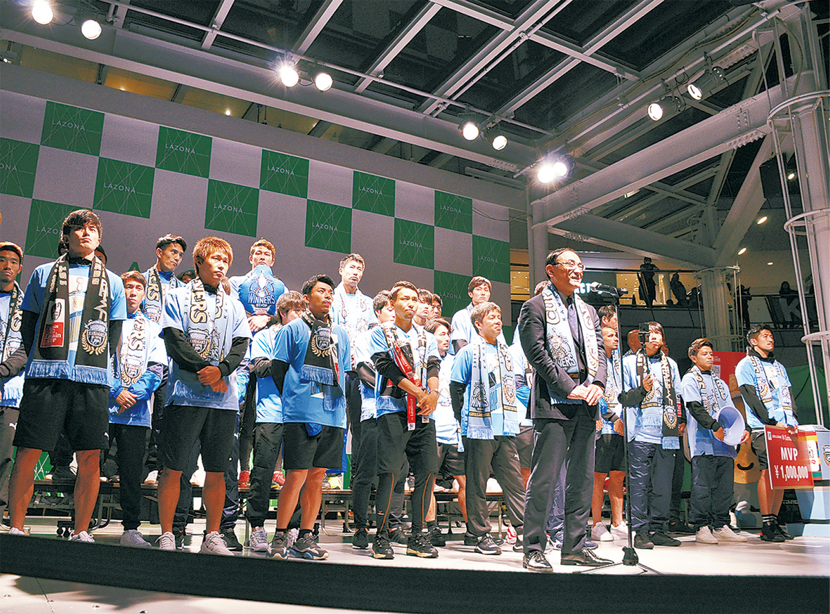 首都圏を襲った10月12日の台風19号は、同クラブの本拠地である等々力陸上競技場周辺にも甚大な被害をもたらした。惨状が伝えられる中、同クラブは「市民とともに歩むクラブとして被災者たちに何ができるのか」を検討。ボランティアを募り、災害ごみの排出作業の手伝いなどに取り組んだ。カップ戦初優勝を懸けた大一番に臨む上で「勝って川崎に笑顔と元気を届けようと、チーム一同、思いを一つにして戦った」と藁科社長は胸中を語る。