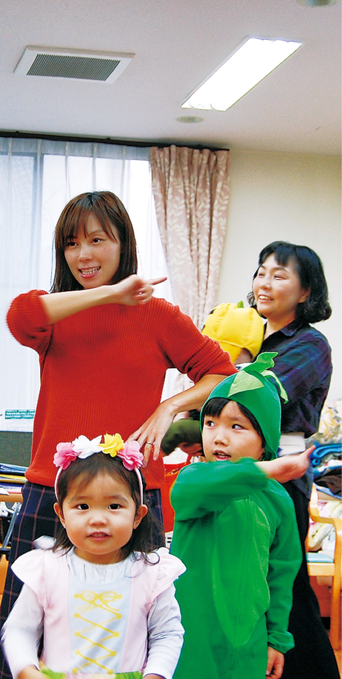 下新城の子育てシェアスペース・おいでおいでルーム(伊東二美江代表)に通う幼児と保護者は10月31日、ルームの近くにある介護施設「グランドステーションらいふ武蔵新城」を訪れ、ハロウィーンパーティーで交流を図った=写真。