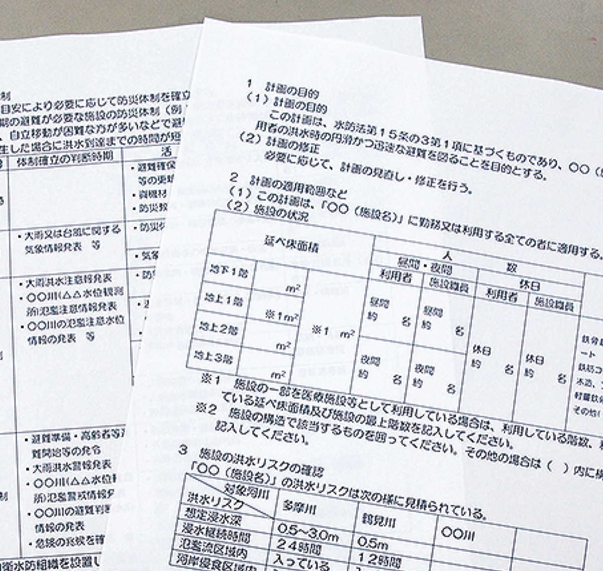 避難確保計画は、避難場所や避難時機、職員対応など、利用者の迅速な避難に必要な事項を記す。浸水想定区域や土砂災害警戒区域にある社会福祉施設や学校など避難に支援が必要な「要配慮者」の利用施設で作成が義務付けられている。