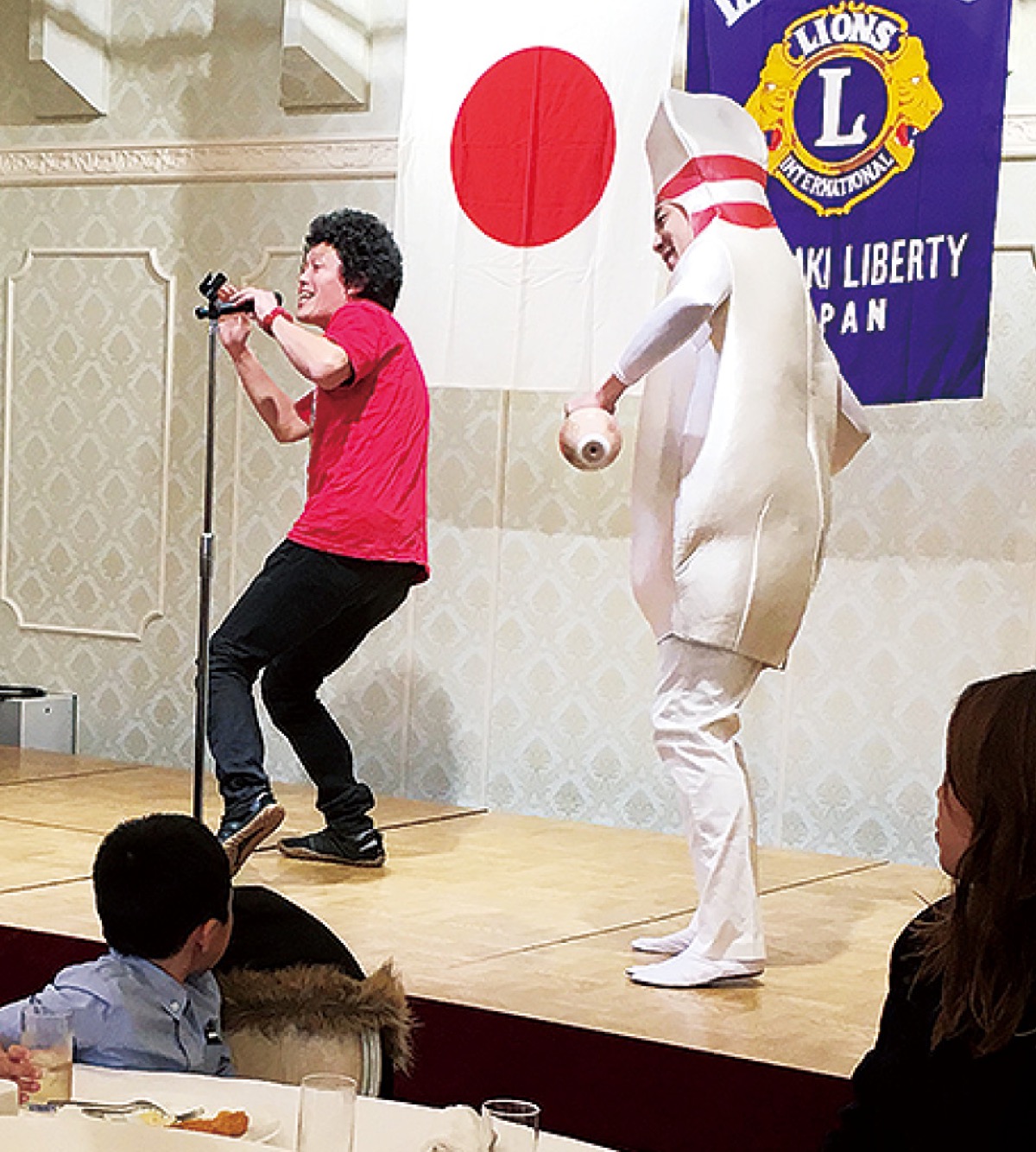 当日は会員など約90人が参加。関口会長が「皆さん仲良く楽しい時間を過ごしてほしい」と挨拶すると、子どもたちはホテルの料理を美味しそうに頬張っていた。その後は、お笑い芸人によるショー=写真上=やビンゴ大会などが行われた。