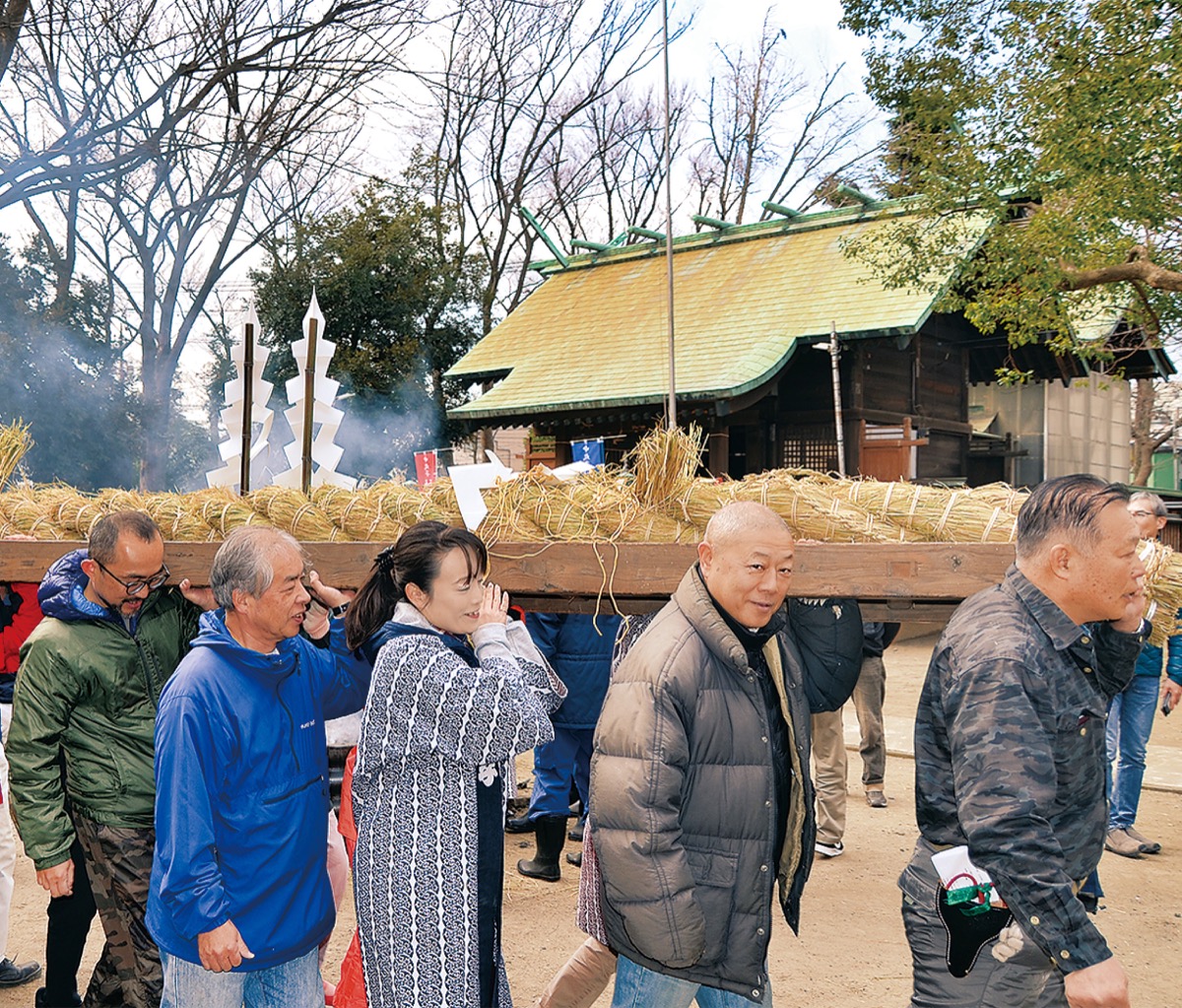 当日は寒空の下、大勢の地域住民が参加。お互い協力しながら約350束の藁で2本のしめ縄を作っていった。できあがった縄の長さは約4メートル。神事の後、住民たちがしめ縄を担いで境内を3周した。しめ縄に触れると今年1年幸せに過ごせるとして多くの人が縄を撫でていた。