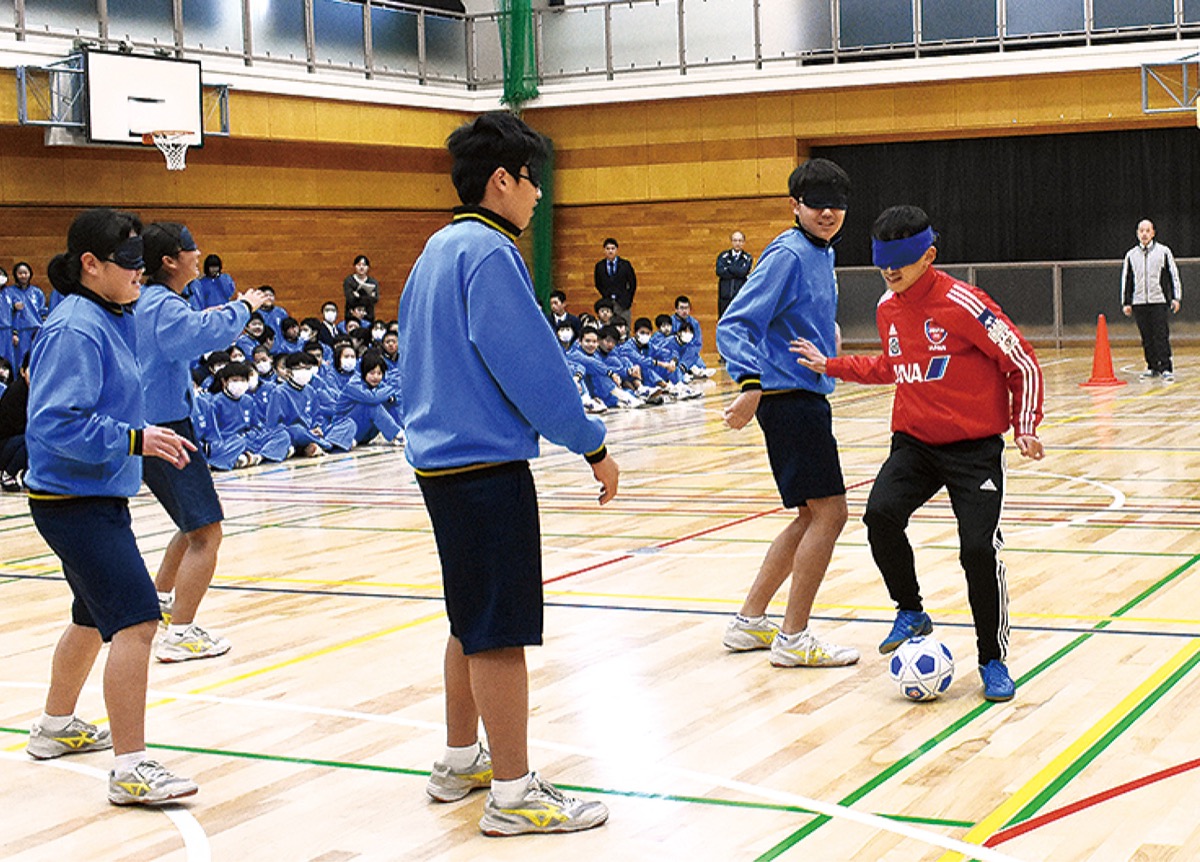 生徒らは、丹羽選手の講演後ブラインドサッカーを体験。生徒3〜4人がチームを組み、アイマスクを着用して丹羽選手1人と対戦。転がると音が出るボールを追いかけ、ミニゲームを楽しんだ。参加した1年の菅原隆斗さん(13)は「全く見えないので、音だけでボールの位置を判断するのが難しかった」と難易度の高さを実感。また、2年の清水翔帆さん(14)は「講演を聞いて身近に感じた。街で白い杖を持って困ってる人がいたら、自分から声を掛けようと思った」と話した。