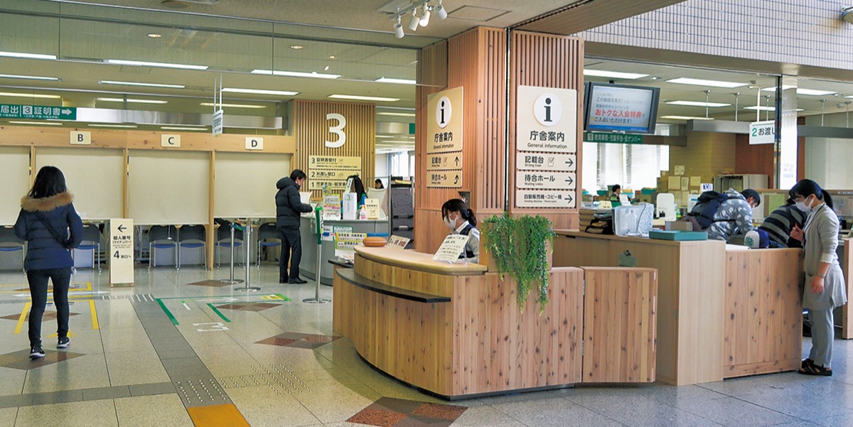 総合案内のカウンターや、ロビーのベンチなどに国産杉を使用して、来庁者が木のぬくもりを感じられる空間を演出。また、フロアの案内表示も新調し、これまで来庁者から寄せられていた「庁舎全体の案内サインが分かりにくい」という声に応えた。