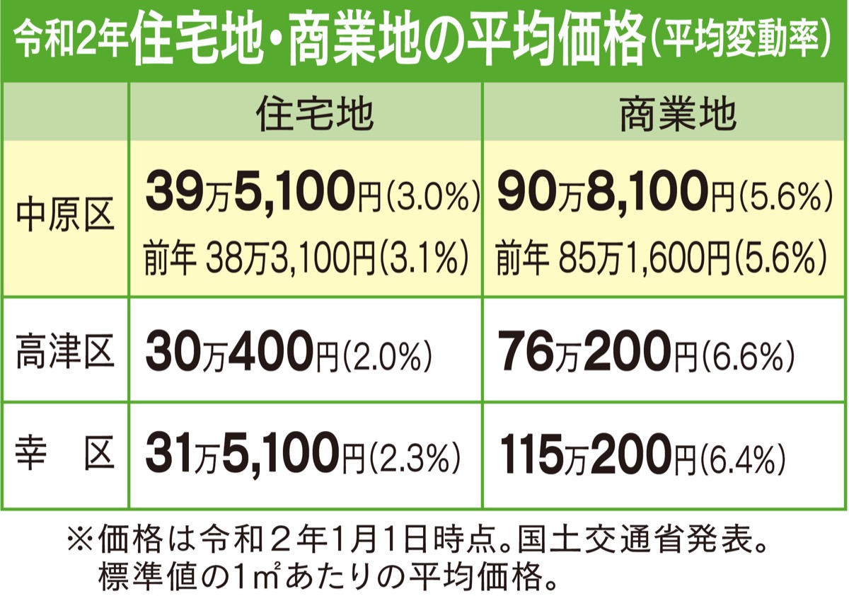 国交省が3月に公表した令和2年の地価公示では、中原区の住宅地は都心へのアクセスの優位性、小杉再開発への期待感などから平均変動率が上昇。区内23の継続調査地点全てで上昇した。また、宅地に接する道路の価格で土地評価額となる2019年分の「路線価」でも、武蔵小杉駅前は前年比10・44%増の201万円/平方メートルと年々上昇を続けている。