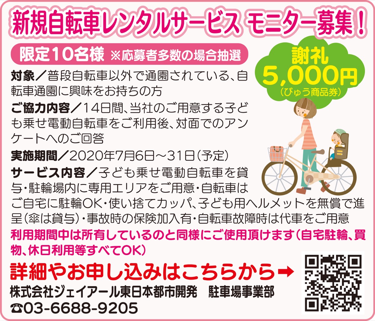 ジェイアール東日本都市開発は、駐輪場区画をセットにした新規自転車レンタルサービスのモニターを募集。限定10人。協力者には謝礼5千円(びゅう商品券)を進呈。