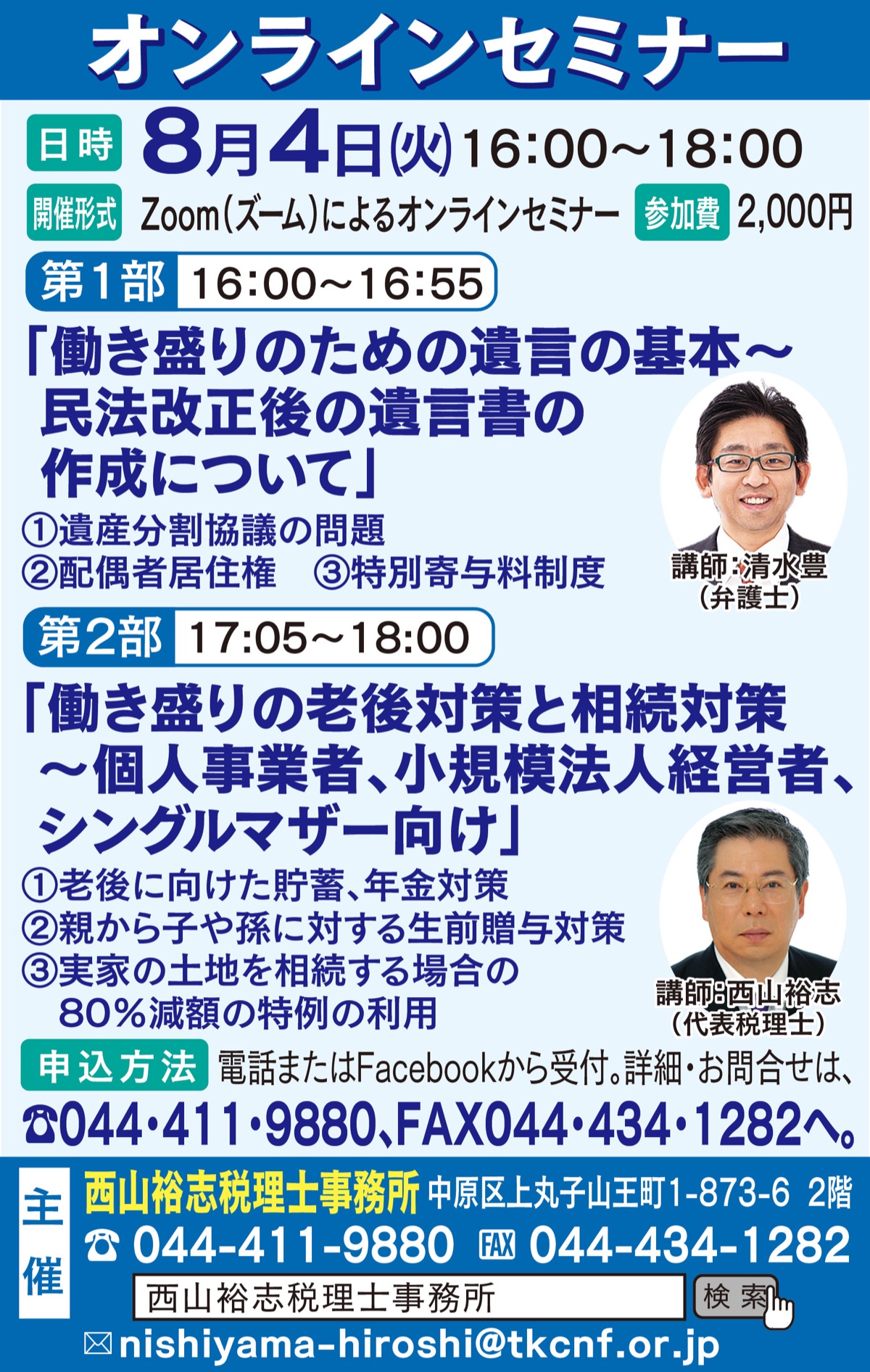 講師は本紙の連載コーナーでおなじみ、全国各地で講演も行う税理士の西山裕志氏(西山裕志税理士事務所)。今回はオンラインによるセミナーを開催。「体験をもとに解りやすくご説明します。お気軽にご参加ください」と西山氏。経験豊富な弁護士の講演も。