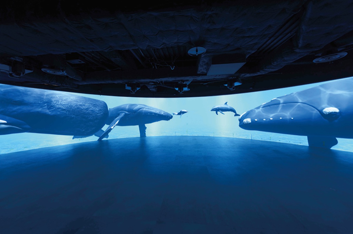夜の営業時間「夜カワスイ」限定で、200度の広角スクリーンに、実寸大のクジラやイルカが映し出される。体の大きさや棲んでいる場所、生態の特徴や食べるものを解説する。