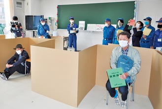 受付時の対応では、避難所を妊婦や障害者などの要配慮者、体調不良者、濃厚接触者、健常者の4つに分類。接触を避けるため、避難の動線も分けられた。昨年の台風では宮内中には300人以上が避難し1教室に30人ほどを受け入れたが、訓練では感染防止のため1教室15人までに制限。体調不良者や濃厚接触者らは、一人ひとりダンボールの間仕切りで隔離し、職員は専用の防護服を着用して体調悪化時の報告手順などを確認した。