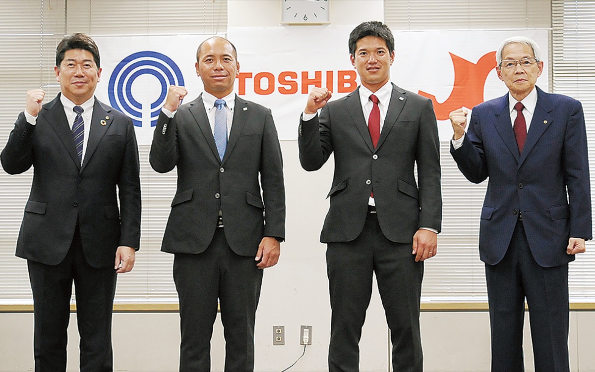 川崎市代表として第91回都市対抗野球大会に出場する「東芝野球部ブレイブアレウス」の村上伸二部長ら4人が今月2日、市庁舎を訪問。市と川崎商工会議所による壮行会が開かれた。