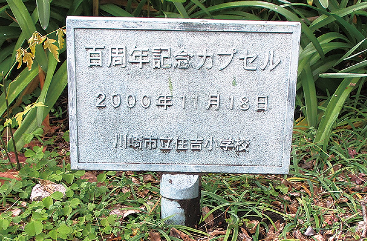 今回予定されていたイベントの一つがタイムカプセルの開封だ。創立100周年が2000年の節目と重なった20年前、次世代へ思い出を残し夢を託そうと、全児童が未来の自分に充てた手紙や作品をカプセルに封入。西門の脇に埋設し、花壇を作り、目印の看板=写真=を設置した。