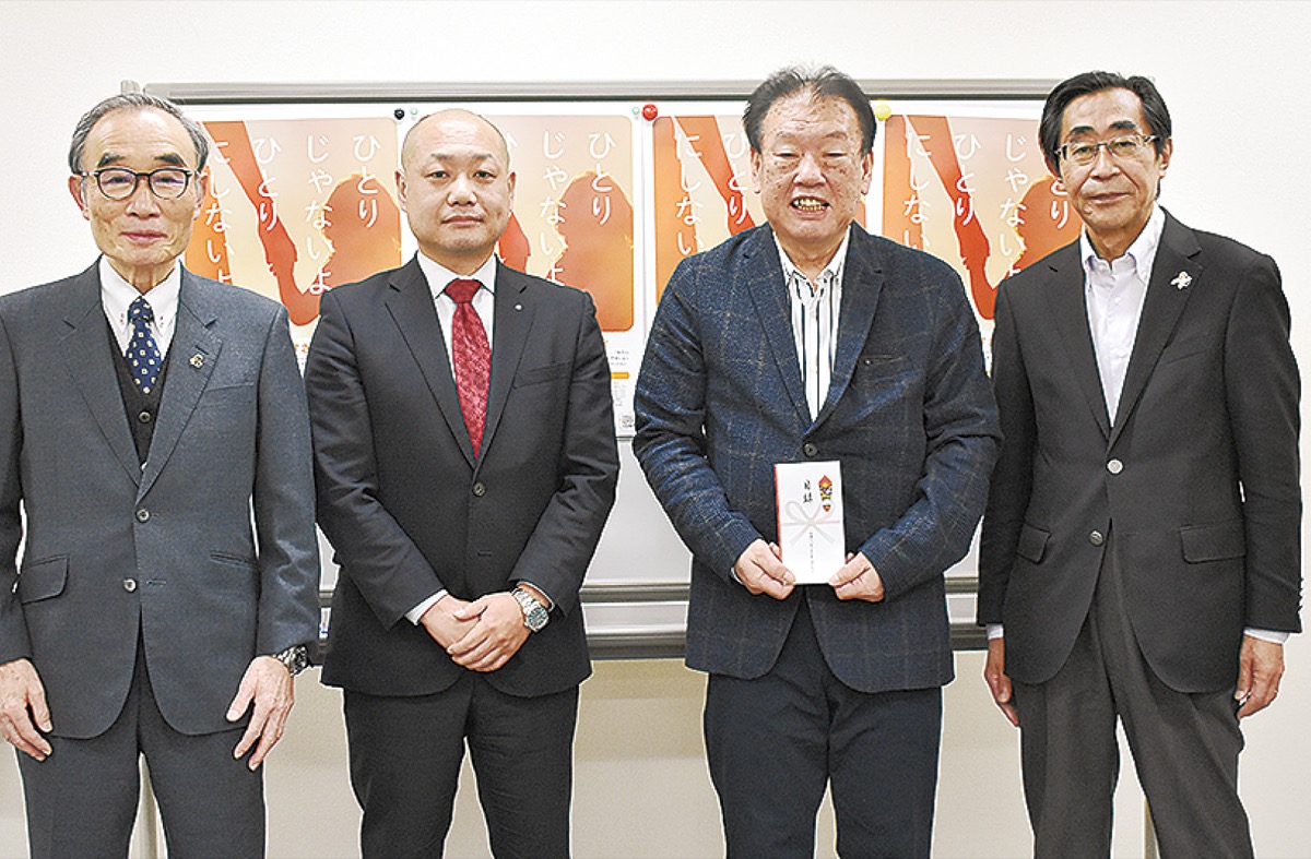 子どもの虐待防止活動を支援しようと、川崎リバティライオンズクラブ(鈴木光因会長)が11月10日、「オレンジリボン運動(川崎)」へ寄付を行った=写真。寄付金は、啓発活動時に使用する横断幕とジャンパー購入費に充てるという。