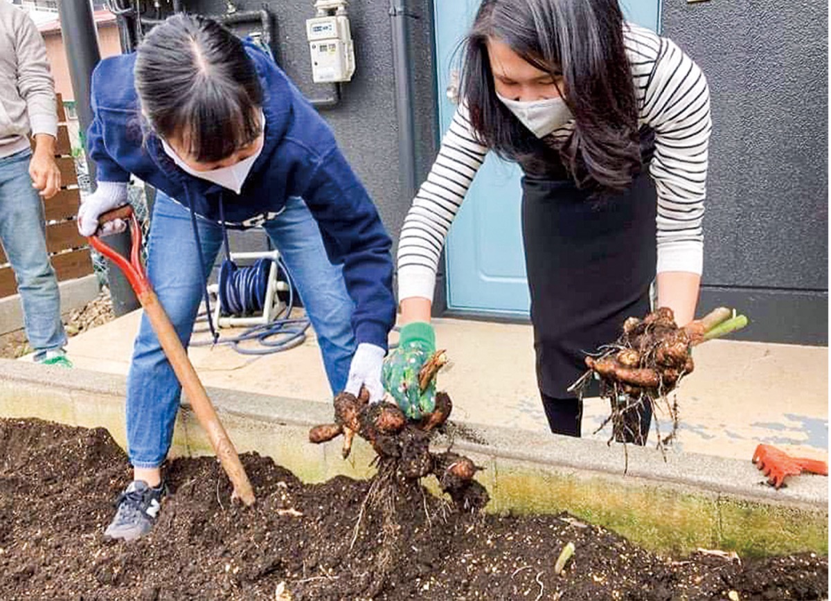 武蔵新城駅近くの集合住宅「第六南荘」で11月8日、住宅裏の花壇で育った里芋217個を収穫=写真。これまで交代で水やりなどを行ってきた近隣住人25人が参加し、芋煮会を行った。
