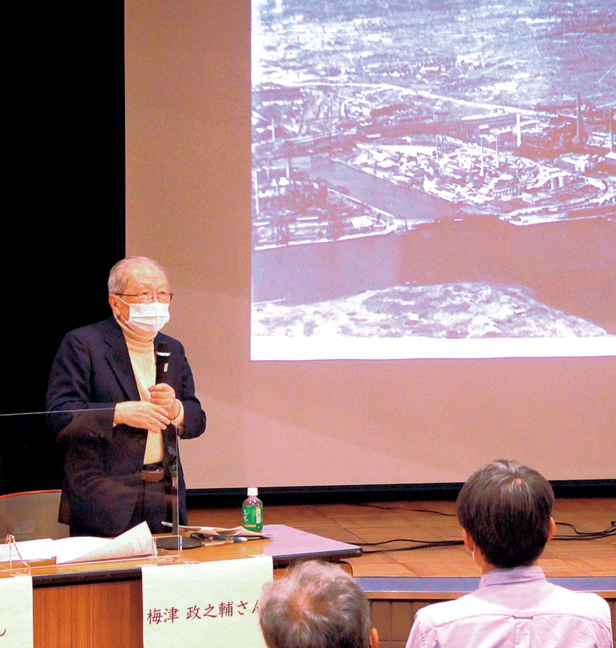 川崎市平和館で3月6日、76年前の川崎大空襲を体験した梅津政之輔さん(90)の講演が行われた。同館で開催中の「川崎大空襲記録展」の企画として、東橘中学校(高津区)の3年生や一般参加者らと平和について理解を深めた。