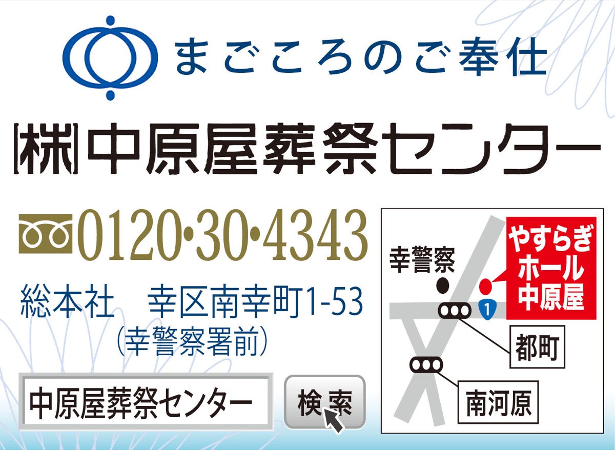 創業90有余年の「中原屋葬祭センター」は、川崎駅西口、南武線矢向駅から徒歩8分に位置。幸警察署前に総本社ビルと複数の式場を構え「清らかな魂に寄り添うお葬式」を心掛ける。