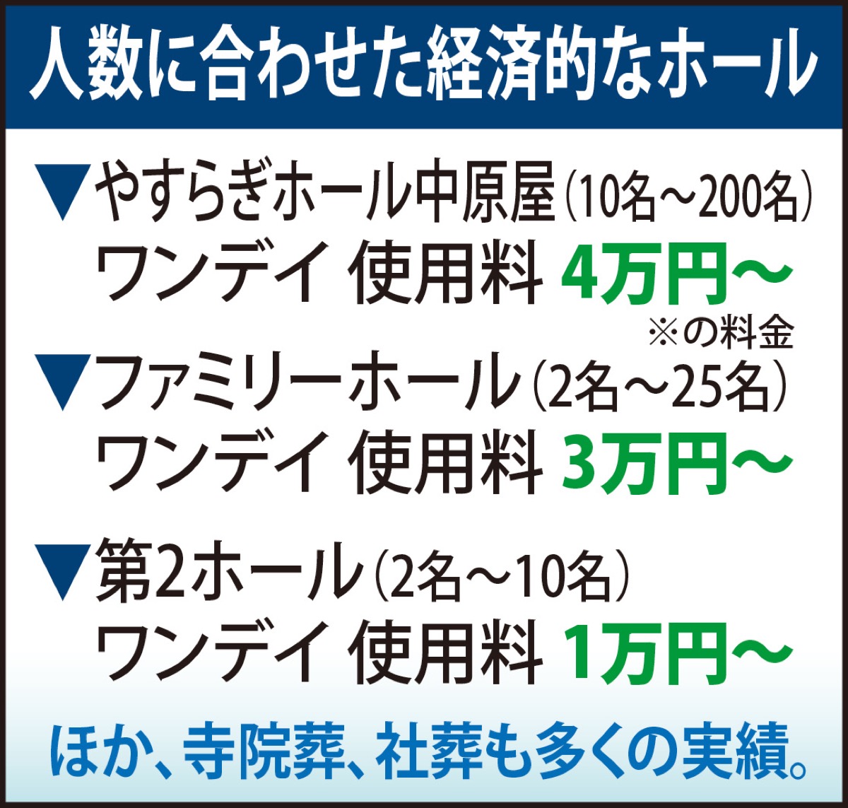 式場はやすらぎホール中原屋のほか、ファミリーホール▽第2ホール▽直葬ホールと、家族や会葬人数にあわせて選べる。「宿泊可能で風呂、シャワー室、ミニキッチン、冷蔵庫などを完備した利用しやすい式場です」と原敏之社長。