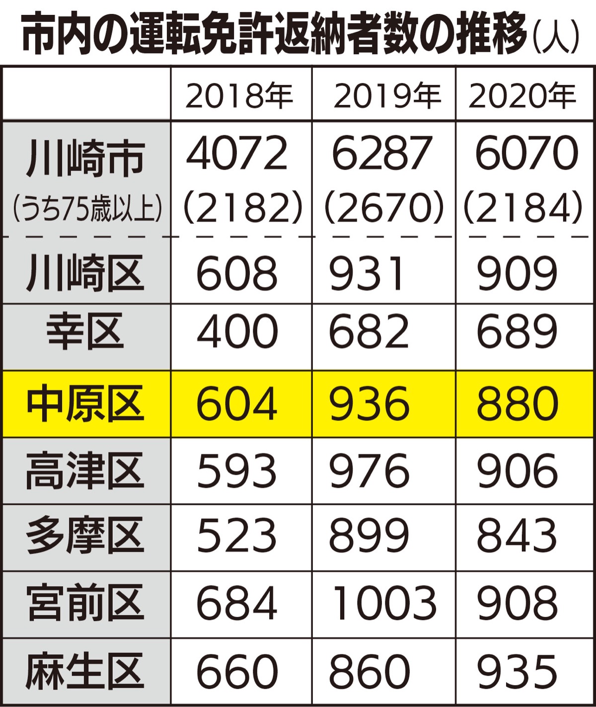 中原区内の返納者は前年比56人減の880人。緊急事態宣言が解除され、外出しやすい季節にもなることから、中原署では「運転に不安があれば、まず相談してほしい」と危機感を強めている。