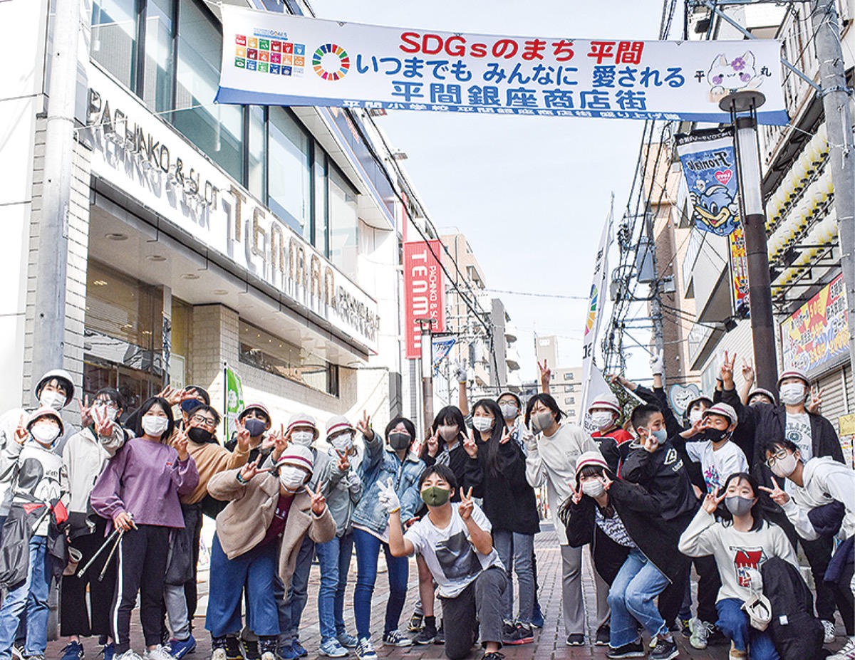 平間小学校(佐川昌広校長)の6年生が今月16日、SDGs(持続可能な開発目標)を呼びかけるオリジナルの横断幕を平間銀座商店街(石井雄介理事長)に掲げた。
