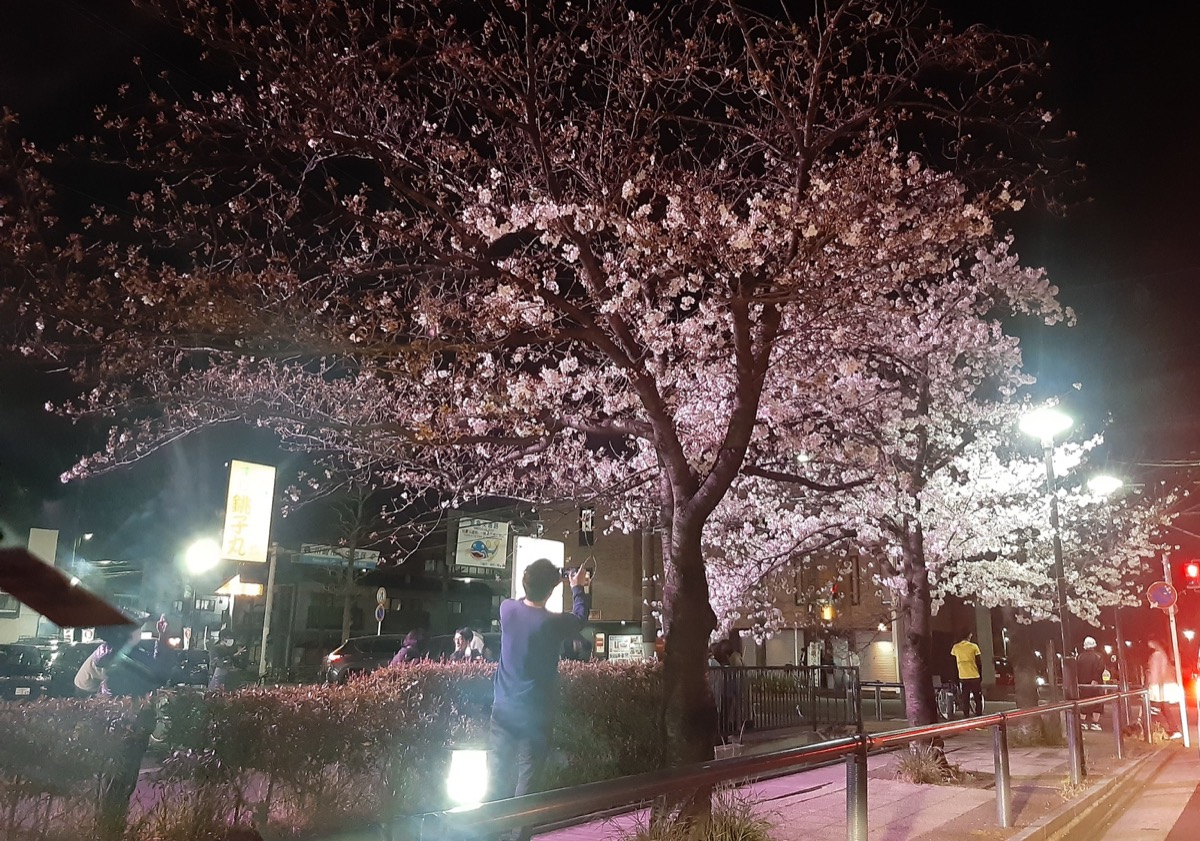 同所では連日、スマホのカメラを桜に向ける人の姿が見られる。「コロナ下で出歩くことが少なくなっているが、皆さんに華やかな気持ちになっていただければ」と石塚代表。ライトアップは午後9時頃まで。満開時はライトアップ時間を延長する予定。